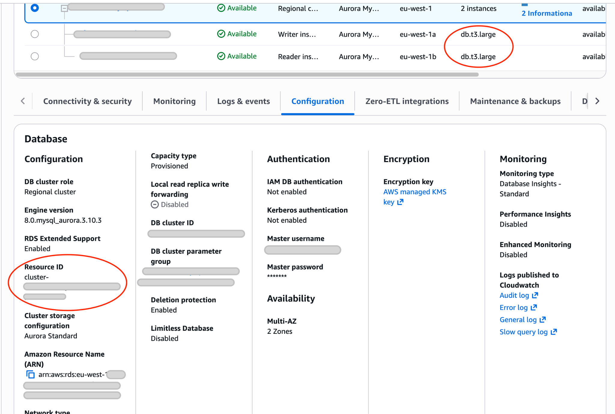 In the billing data, you won’t see the instances linked to the cluster ARN. To do that, open the AWS Console, go to Aurora and RDS, Databases. By clicking on a cluster and then the Configuration tab, you will be able to spot the ARN of that cluster.