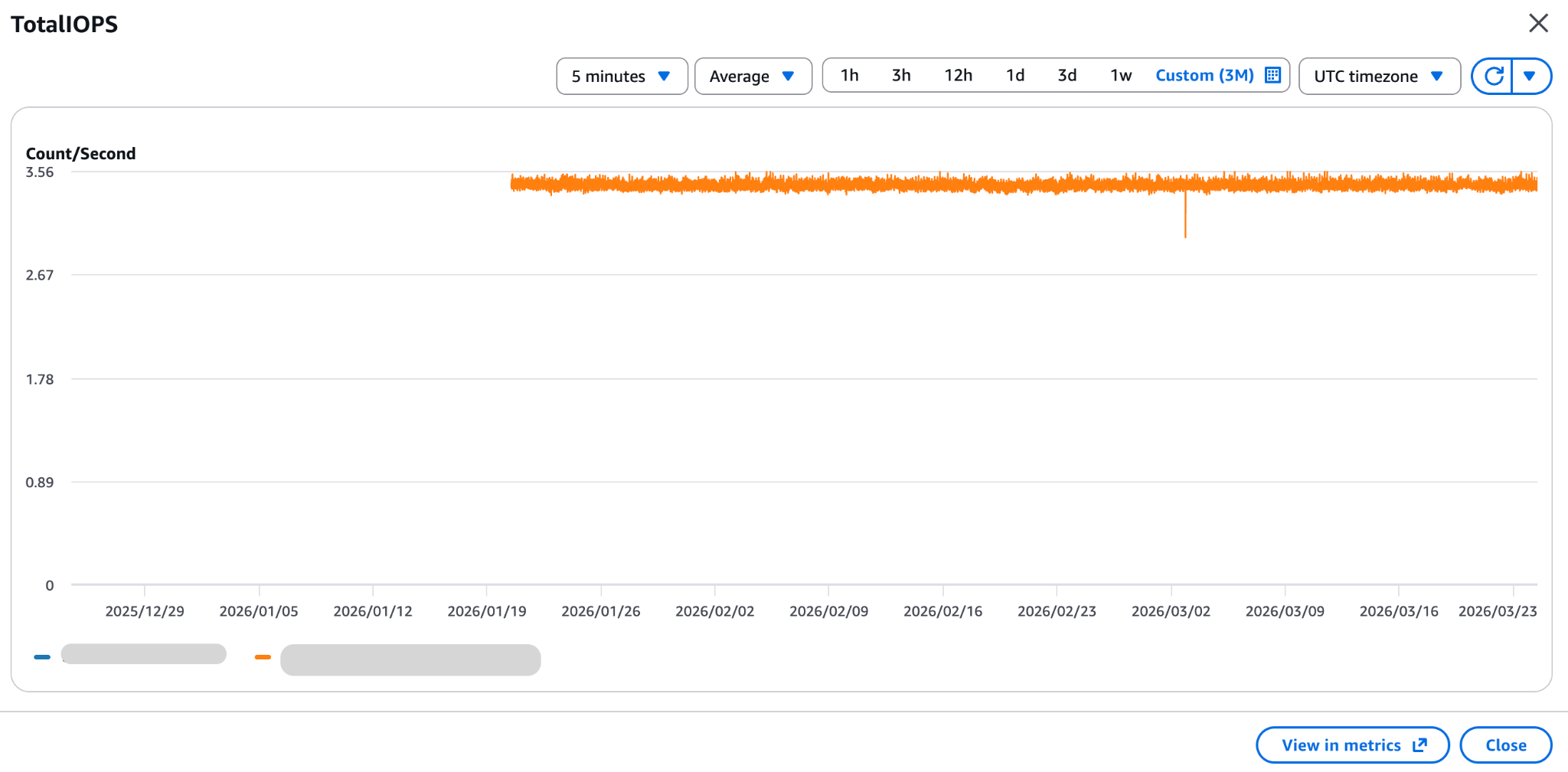 As the requests are now free, they are no longer visible in the billing data, so we need to investigate the CloudWatch metrics. Doing that is relatively simple - go to Aurora and RDS in the console and find the needed cluster. Then click on Monitoring and look for the TotalIOPS metric.