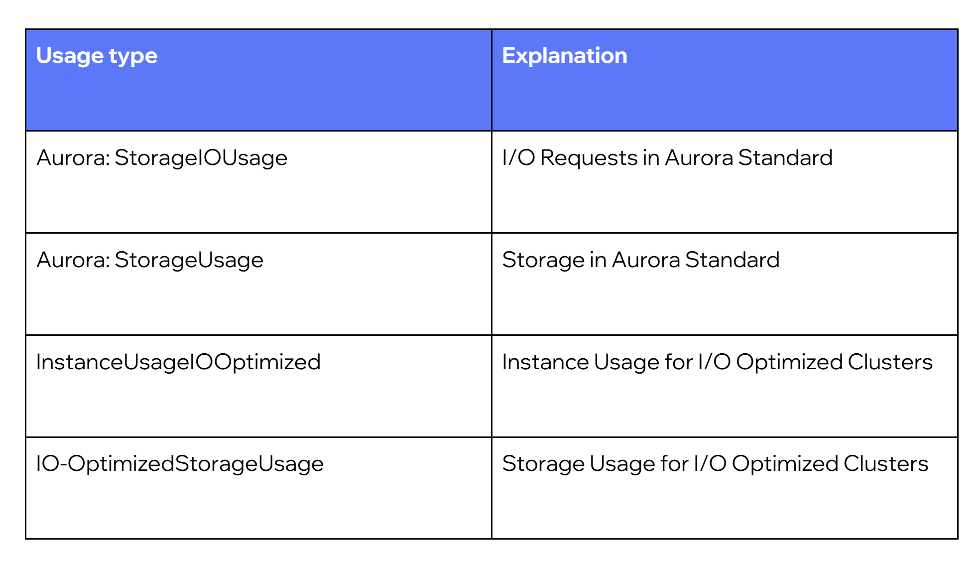 If you are starting your investigation from the billing data, you can identify if the cluster runs under Aurora I/O Optimized pricing configuration by checking the usage type. InstanceUsageIOOptimized is the usage type for instances under Aurora I/O Optimized, and Aurora: IO-OptimizedStorageUsage is the usage type for storage usage. In the billing data, you won’t see billing or usage related to the I/O request itself, as they are now free.